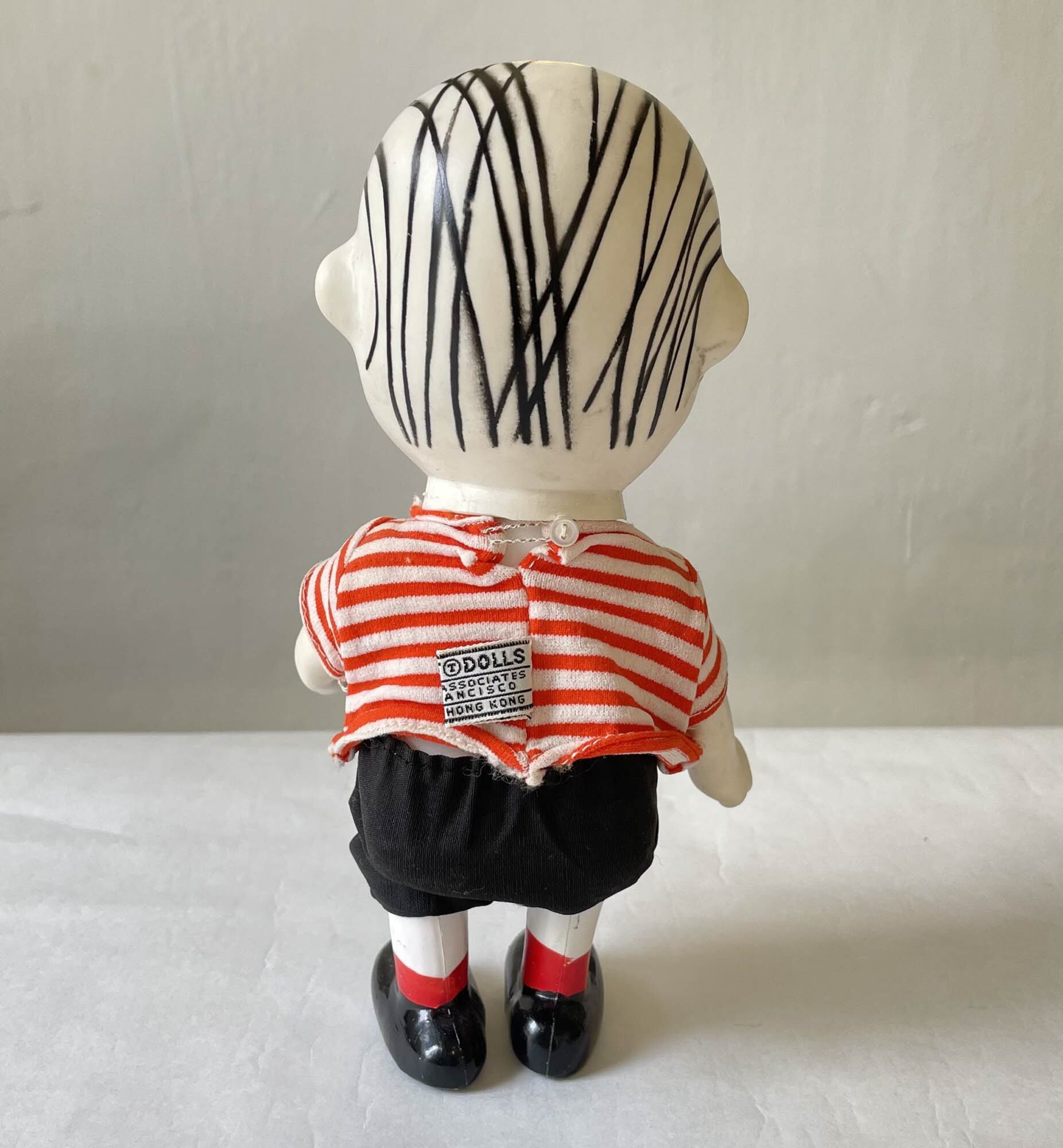 表情はニコッと微笑んでいるような表情で、赤いボーダーTシャツに黒いズボンを着てまっすぐ立っているフィギュアです。