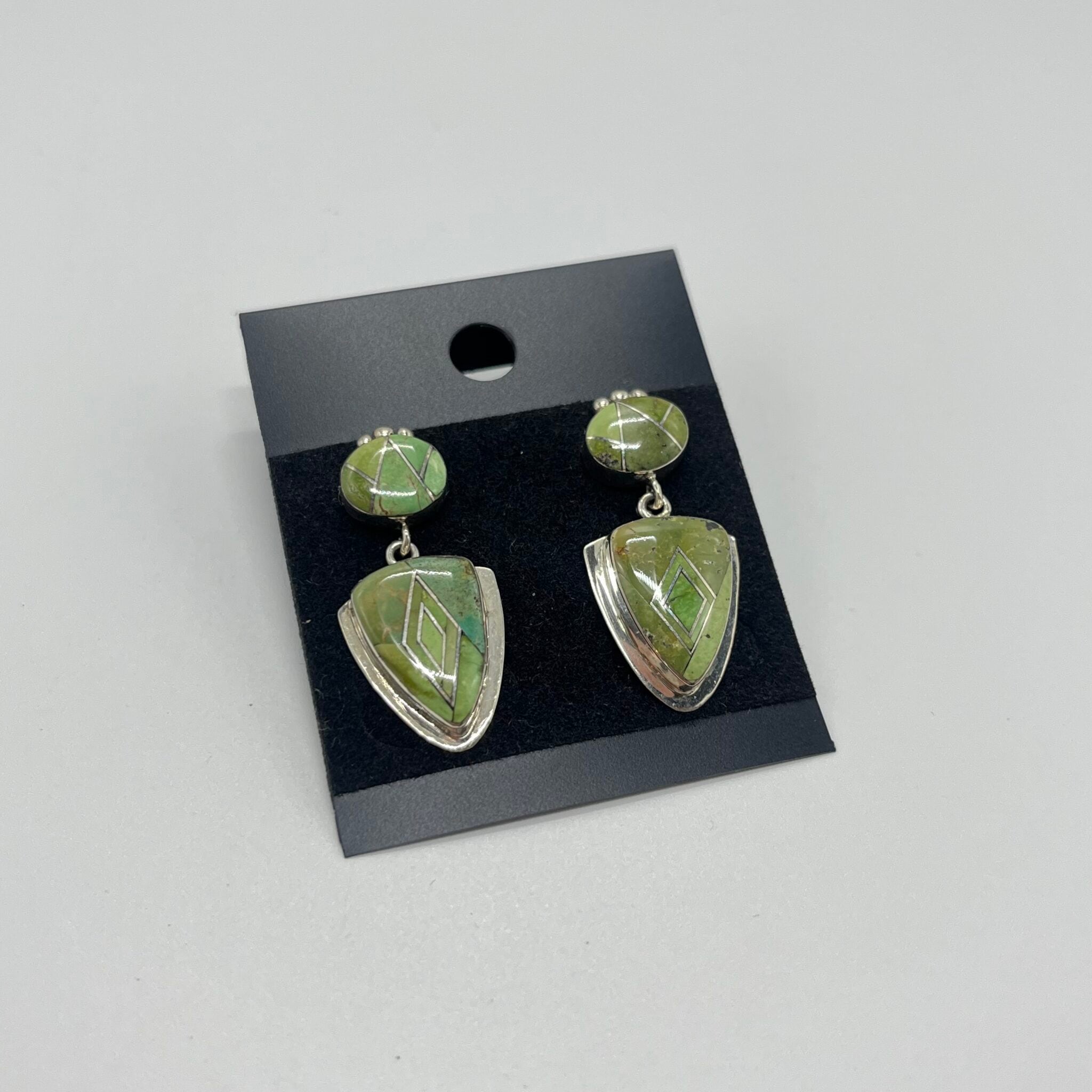シルバー製、グリーン系のターコイズかグリーンガスペイトと思われるストーンが敷き詰められたピアスです。